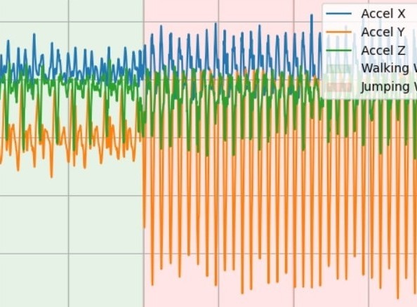 A function segments incoming CSV data into time-based windows and feeds them through the trained logistic-regression model and normalization scaler (loaded via joblib), allowing the classify_csv routine to generate real-time predictions on user data. On the GUI side, the user interface was built using Tkinter, with classification results visualized using matplotlib. Colour coded overlays indicate detected activity types alongside timestamped labels.